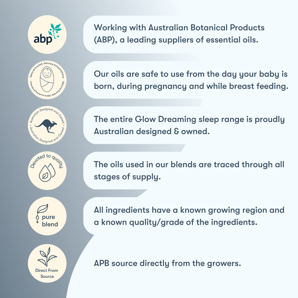 An essential oil designed to help bring sleep to those who need it most. Adding a few drops of Glow essential oils to your Glow Sleep Easy Humidifier or your Glow Travel Sleep Easy Scent Nebuliser can enrich your sleep routine every night, creating a relaxing atmosphere for your little one.