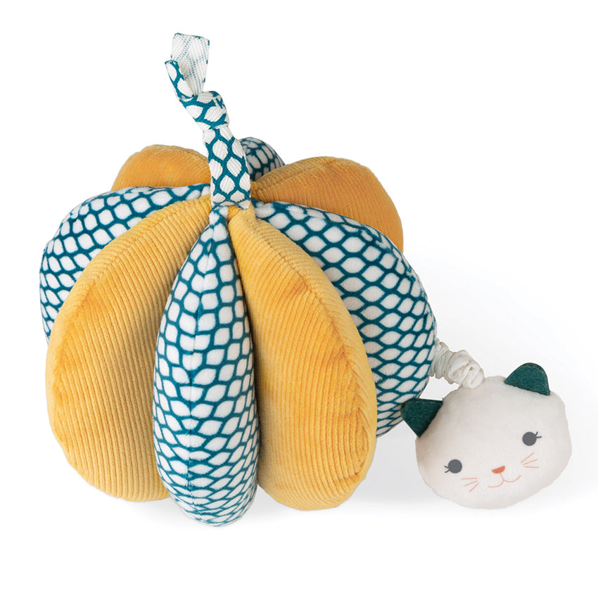 The Hand Grip Ball with alternate fabric panels in high-contrast colours and textured fabrics allow for a soft, fluffy and visually stimulating experience. Gently pull on the cat and feel the vibrating mechanism to engage baby and aid in the development of fine motor skills, hand-eye coordination and to awaken baby's sense of touch.