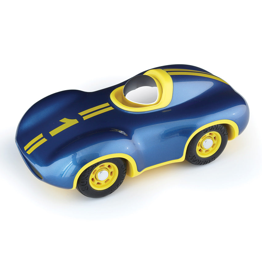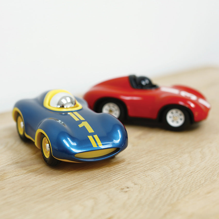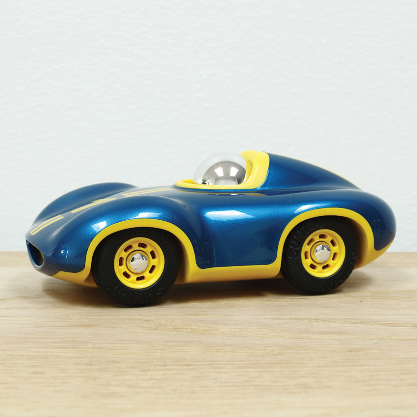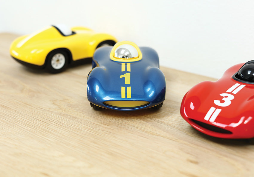 The Mini Boy is a striking metallic blue with yellow trim and chrome helmet and wheelcaps. Designed in the UK the Playforever range is made from heavy duty plastic and moving rubber wheels for easy handling. With sleek lines and gorgeous curves you can put it on the shelf for decoration or use it for everyday play!
