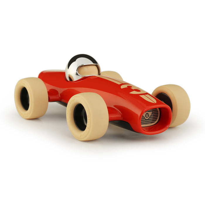 Look out Fangio here comes Benjamin! Super cool good looks in orange-red with movable cream wheels and matching racing stripes Benjamin is made from heavy duty plastic which is robust and solid. He has a chrome helmet and will launch dreams of being the next formula one driving champion!