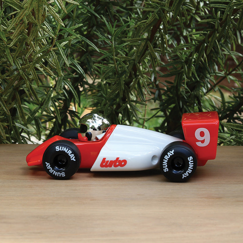 Turbo Lauper is bright red-orange and white with massive air ducts and bold graphics. Matching box wings and chrome helmet complete the tangible aesthetics Playforever is famous for. Reminiscent of Formula 1 in the 80's the Playforever Verve Turbo series has authentic design with a flawless finish. Solidly constructed from heavy duty plastic with high gloss UV-resistant paint and rolling smoothly on soft rubber tyres they look just as good on the shelf as they do at play. You may not be able to buy the real thing but Playforever's Turbo series is sure to bring delight to any toybox mantelpiece office or man cave.