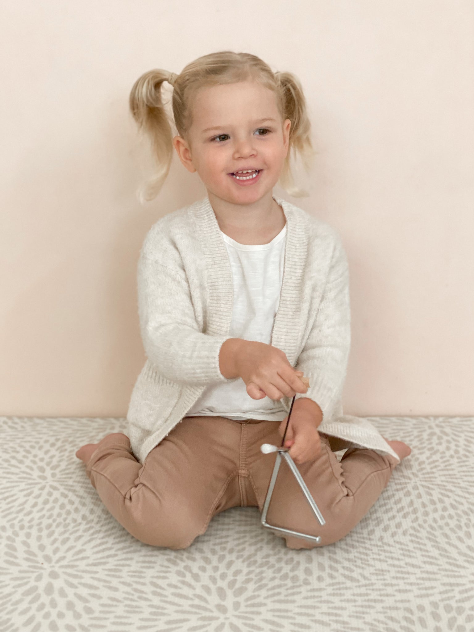 Our triangle is the perfect instrument to promote the use of fine motor skills, allowing your little one to use their tiny fingers to grasp onto the string and then strike the triangle to create a beautiful bright ringing tone. The triangle produces lots of harmonics, which give it a very distinct sound!