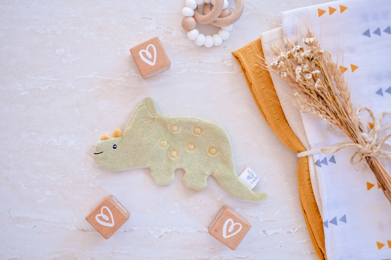 There is something satisfying about feeling this crinkle scrunchie Triceratops toy. It crackles and crunches offering a sensory experience for little ones. The sound and feel of the fabric will capture a baby's attention while offering benefits to their development as well. A great toy for distracting and entertaining while getting their nappy changed or while out and about.