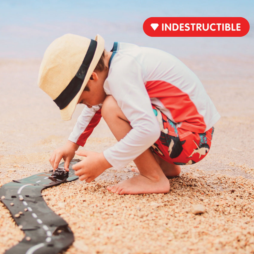 The waytoplay Ringroad car track is a flexible beginner set for younger children. Create various road layouts with 12 pieces. Encourage imaginative open ended play and combine with other toys in your toy box to create a real personal play scene. Tactile and easy to assemble little hands will delight in creating different tracks. Durable for both indoor and outdoor play this range is able to be used on practically any surface and in any weather conditions. Waterproof and easy wipe clean play at the beach in the bath or in the garden. Can also be used to expand your other waytoplay tracks. Waytoplay is a premium road track system which is printed on both sides to ensure the optimum level of play variations are truly available.