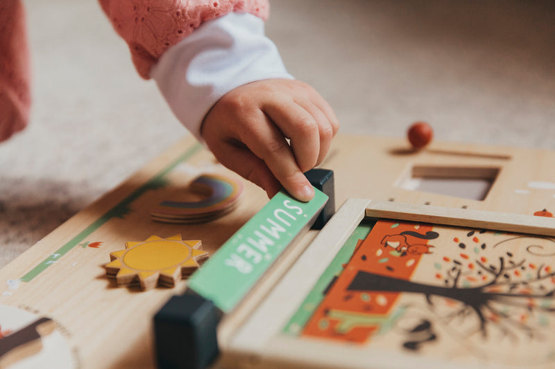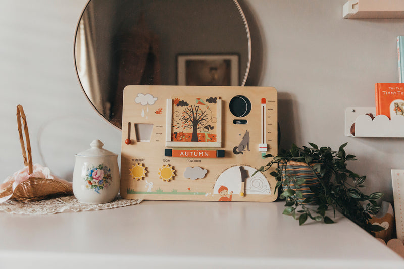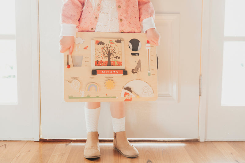 A top-quality illustrated wood Weather station that links all aspects of climate into a simple and educational board that can be hung up on a wall or played with on a tabletop.
